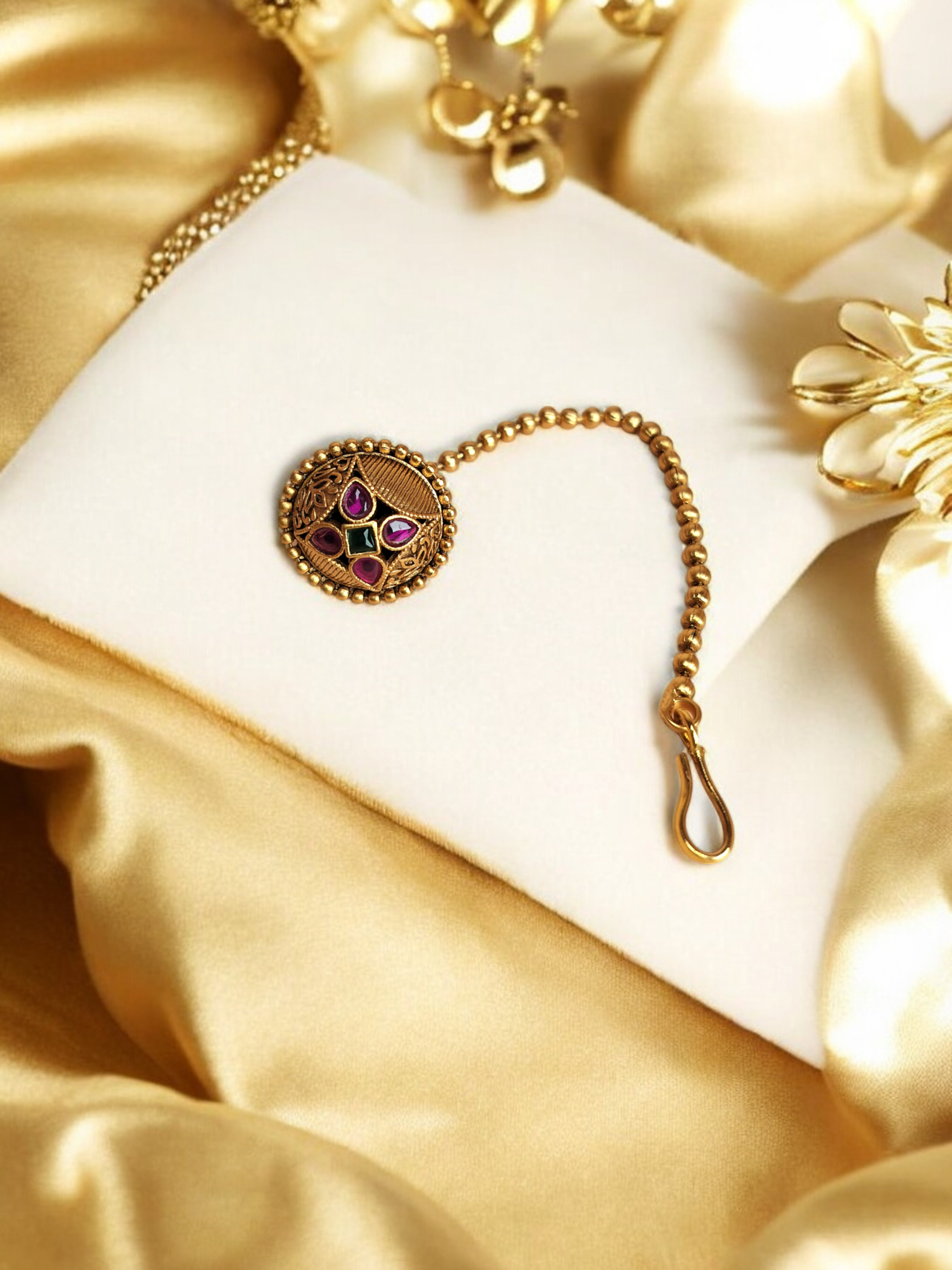 - Design: Rajasthani borla design with kundan embellishments